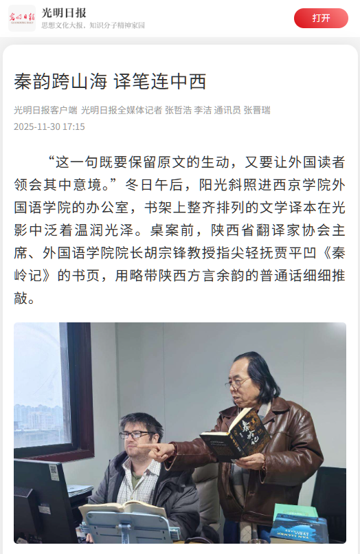 近日,光明日报以《秦韵跨山海译笔连中西》为题,对我校外国语学院院长、陕西省翻译家协会主席胡宗锋教授深耕陕西文学翻译、推动中国文化走向世界的事迹进行了专题专访报道,详细呈现了他与国际搭档罗宾・吉尔班...