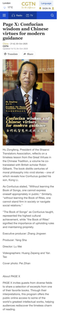 近日,陕西省翻译协会主席、西京学院外国语学院院长胡宗锋教授受邀参与CGTN《PAGE X》节目,围绕其与西京学院外国语学院教授、英国学者罗宾·吉尔班克合译的《Great Virtues in the Chinese Tradition》(《中华传...