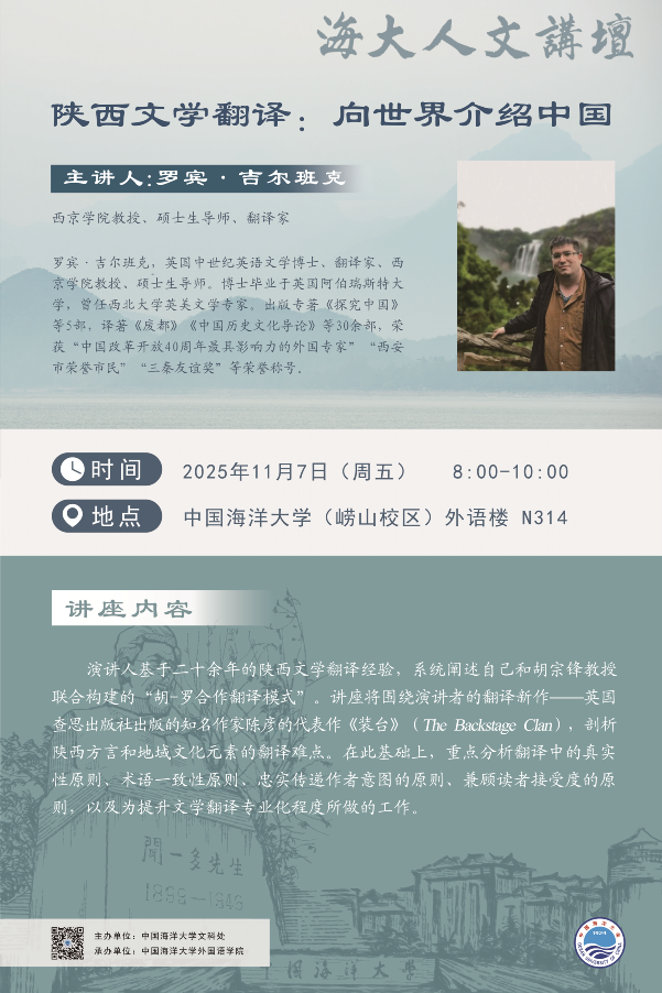 11月7日8:00-10:00,罗宾・吉尔班克教授接续开讲,以“陕西文学翻译:向世界介绍中国”为题分享研究成果。本次讲座由中国海洋大学文科处主办、外国语学院承办,纳入学校“海大人文讲坛”系列。