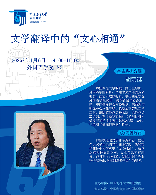 11月6日14:00-16:00,胡宗锋教授在中国海洋大学崂山校区外语楼N314教室带来题为“文学翻译中的文心相通”的讲座。该讲座由中国海洋大学研究生院主办、外国语学院承办,是学校“百川讲坛”系列活动之一。