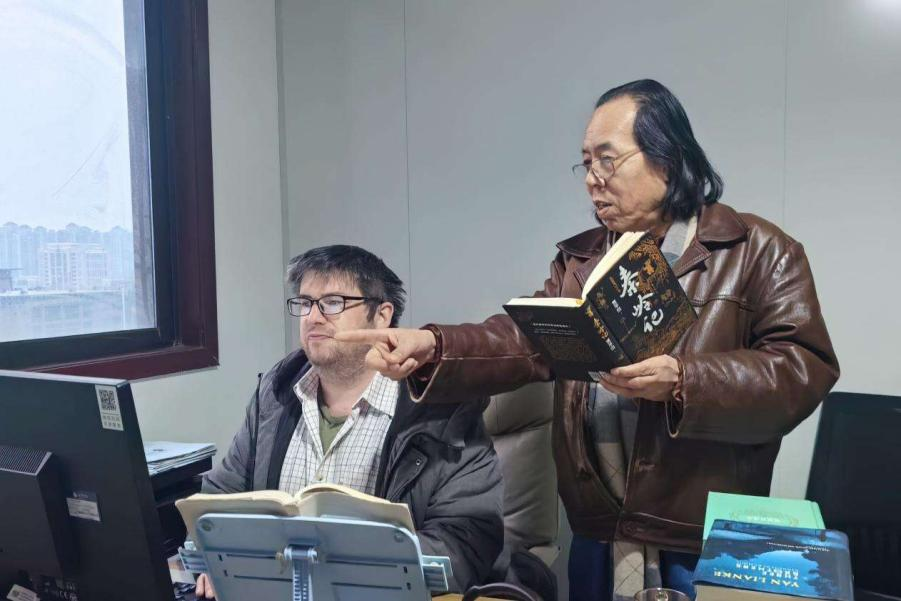 旁边,西京学院外国语学院教授罗宾·吉尔班克推了推眼镜,笔尖在笔记本上快速记录。两人时而俯身比对词句,时而各自伏案批注,偶尔因一个精妙的译法相视而笑,眉眼间尽是17年磨合的默契。