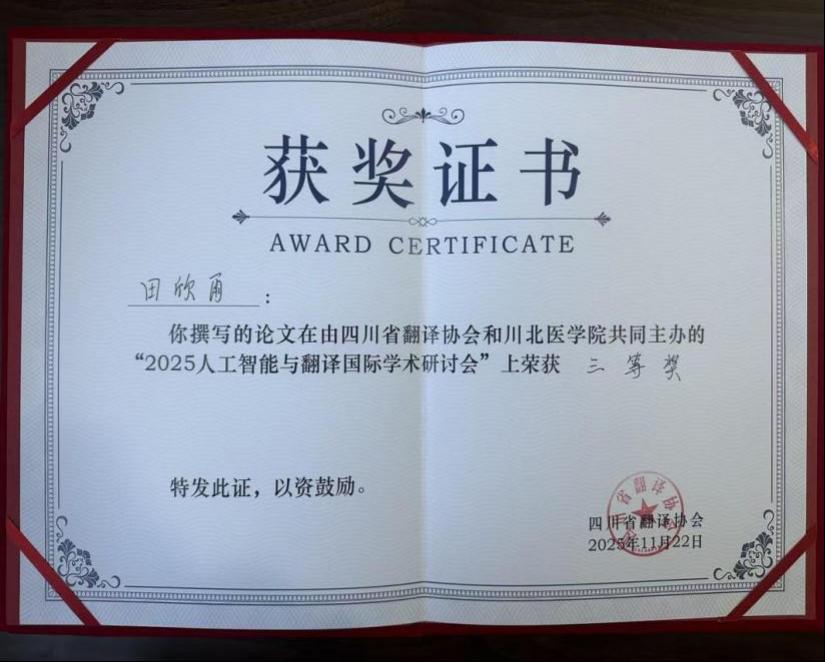 11月21日至23日,由四川省翻译协会与川北医学院联合主办的“2025人工智能与翻译国际学术研讨会”在四川南充成功举办。我院翻译专业硕士研究生田欣雨凭借聚焦人工智能时代翻译实践创新的优质论文荣获会议论文三等奖。